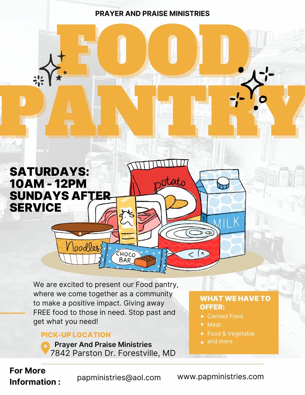 Spirit filled family church offers FREE food distribution every Sunday after worship Service. Stop past from 12PM-2PM!